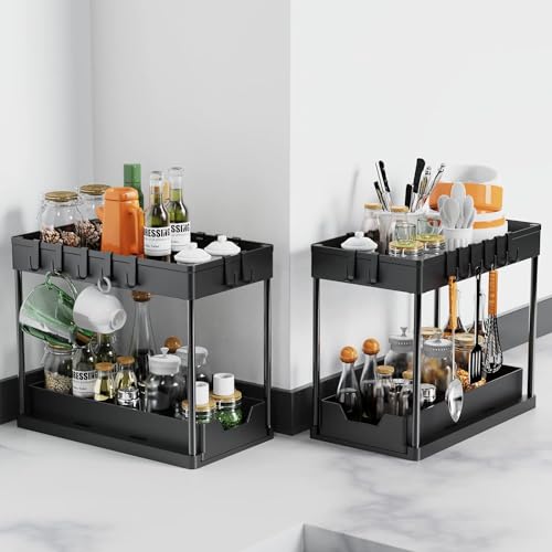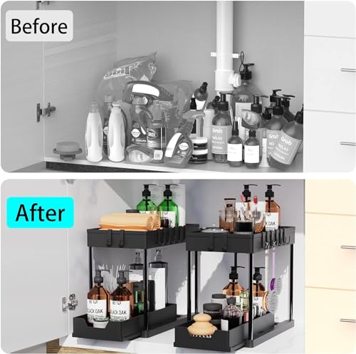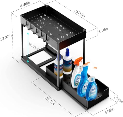 【Sliding Basket】Meltrck onder de gootsteenorganizer is anders dan andere. De 2-laags organizer bevat een vaste en verschuifbare mand. Biedt gemakkelijke toegang tot items bij toegang tot kasten onder de gootsteen. Wordt geleverd met 8 haken om kleine spullen op te hangen, zodat alles georganiseerd blijft.
