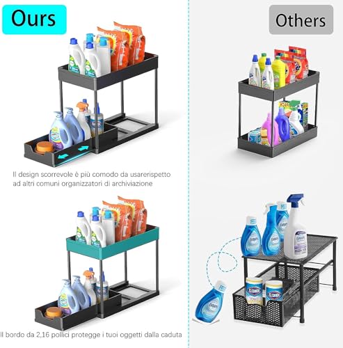 【Sliding Basket】Meltrck onder de gootsteenorganizer is anders dan andere. De 2-laags organizer bevat een vaste en verschuifbare mand. Biedt gemakkelijke toegang tot objects bij toegang tot kasten onder de gootsteen. Wordt geleverd met 8 haken om kleine spullen op te hangen, zodat alles georganiseerd blijft.